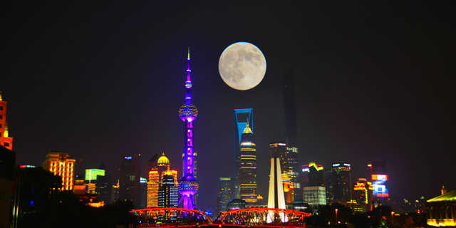 圖為中秋月圓照亮上海夜空與東方明珠瑤相輝映。今晚的賞月最佳時間段是晚上的9點以后,上海山卓重工祝您和您的家人有一個美好的夜晚。